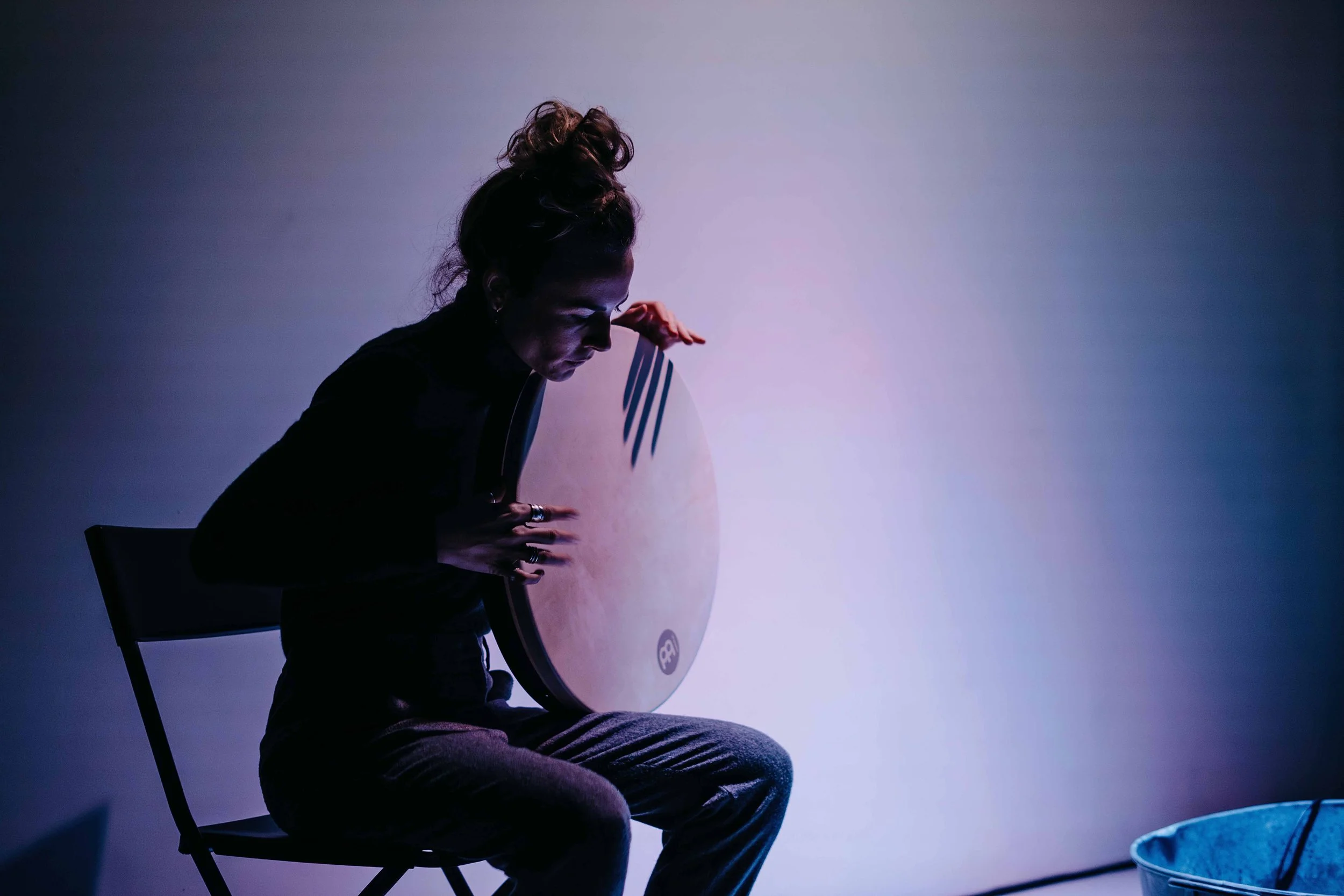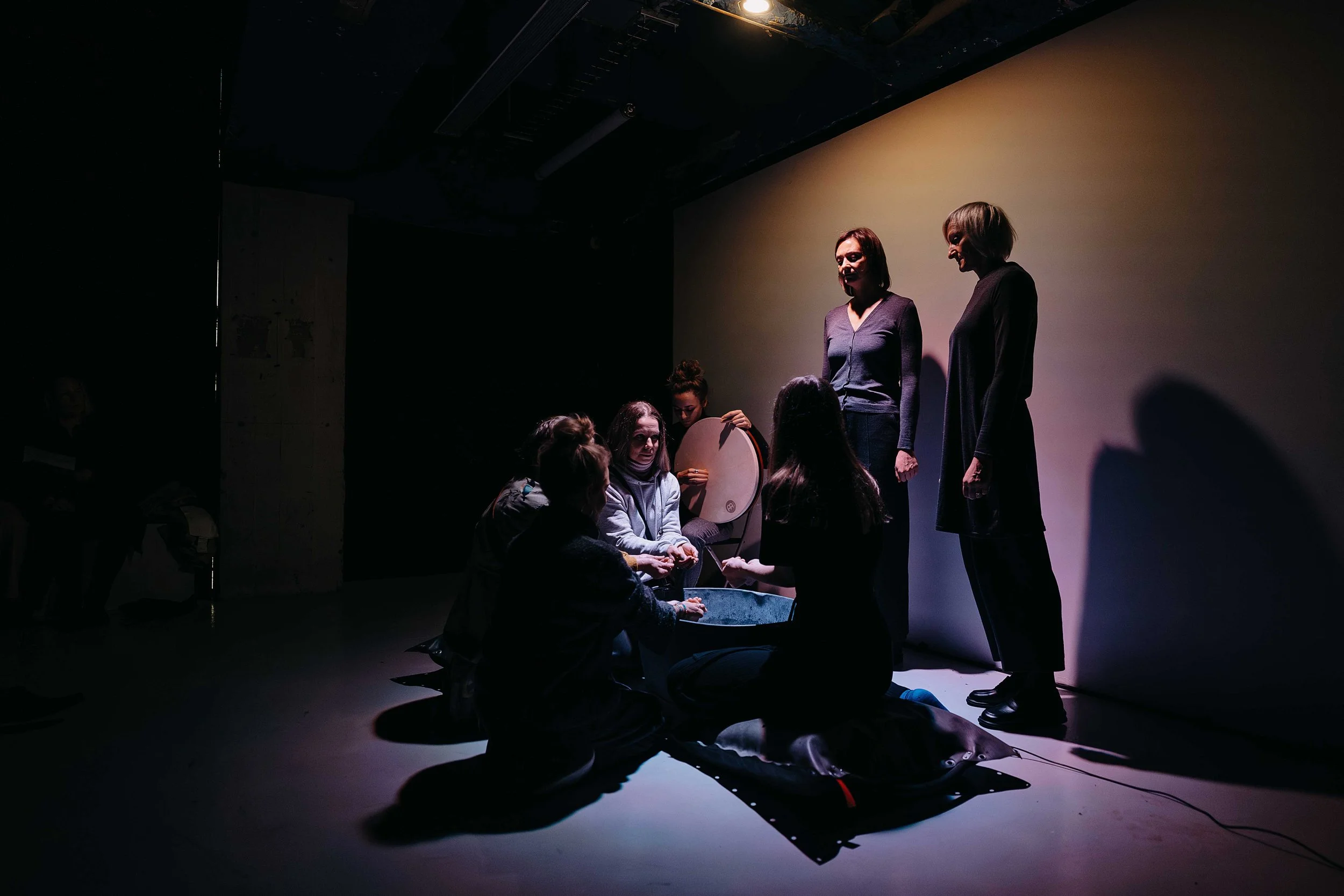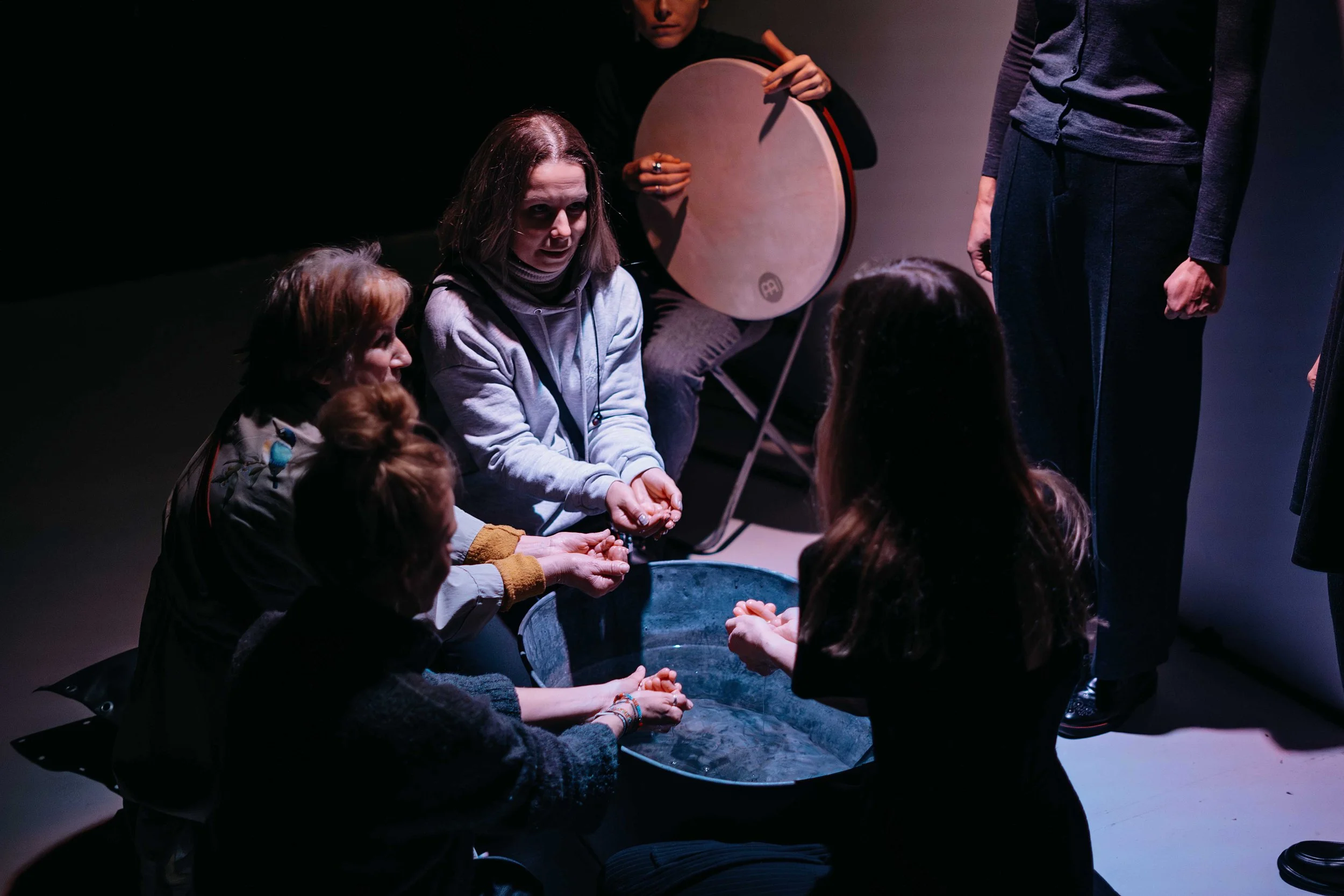 Dans une pièce obscure, un bassin illuminé est entouré de coussins accueillant le public. Au son du bendir, Viktorija tente de retenir l’eau entre ses mains, symbolisant l’éphémère et la fragilité de cette ressource. En chantant un chant lituanien, accompagé d’un chœur, elle invite le public à un acte collectif de partage et de solidarité. Retenir l’eau est une méditation sur notre lien intime et vulnérable avec les éléments essentiels de notre quotidien, incarnant le dilemme entre maîtrise et impermanence.
